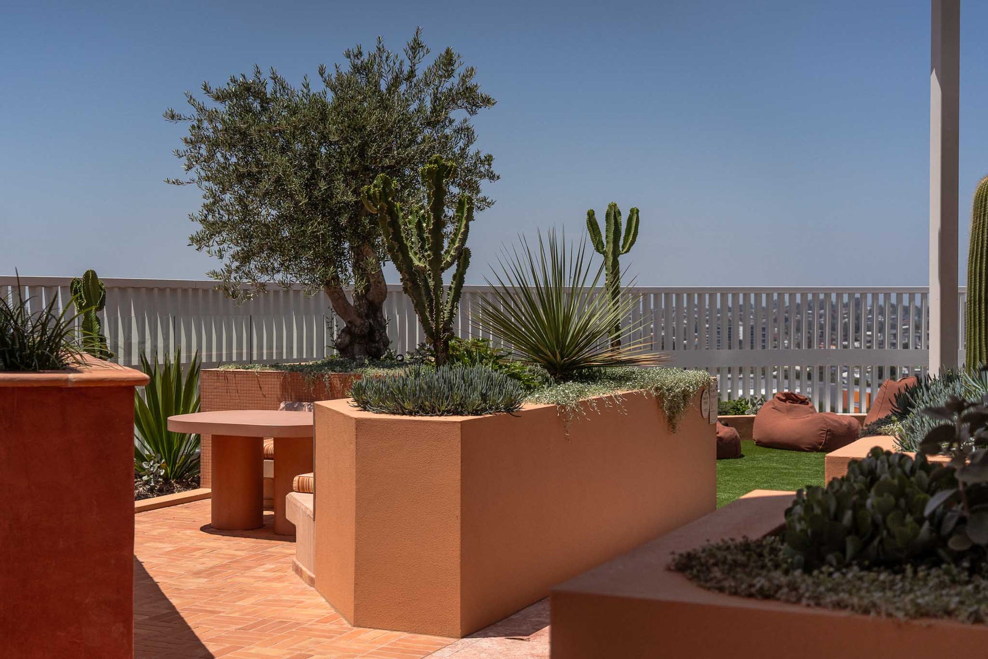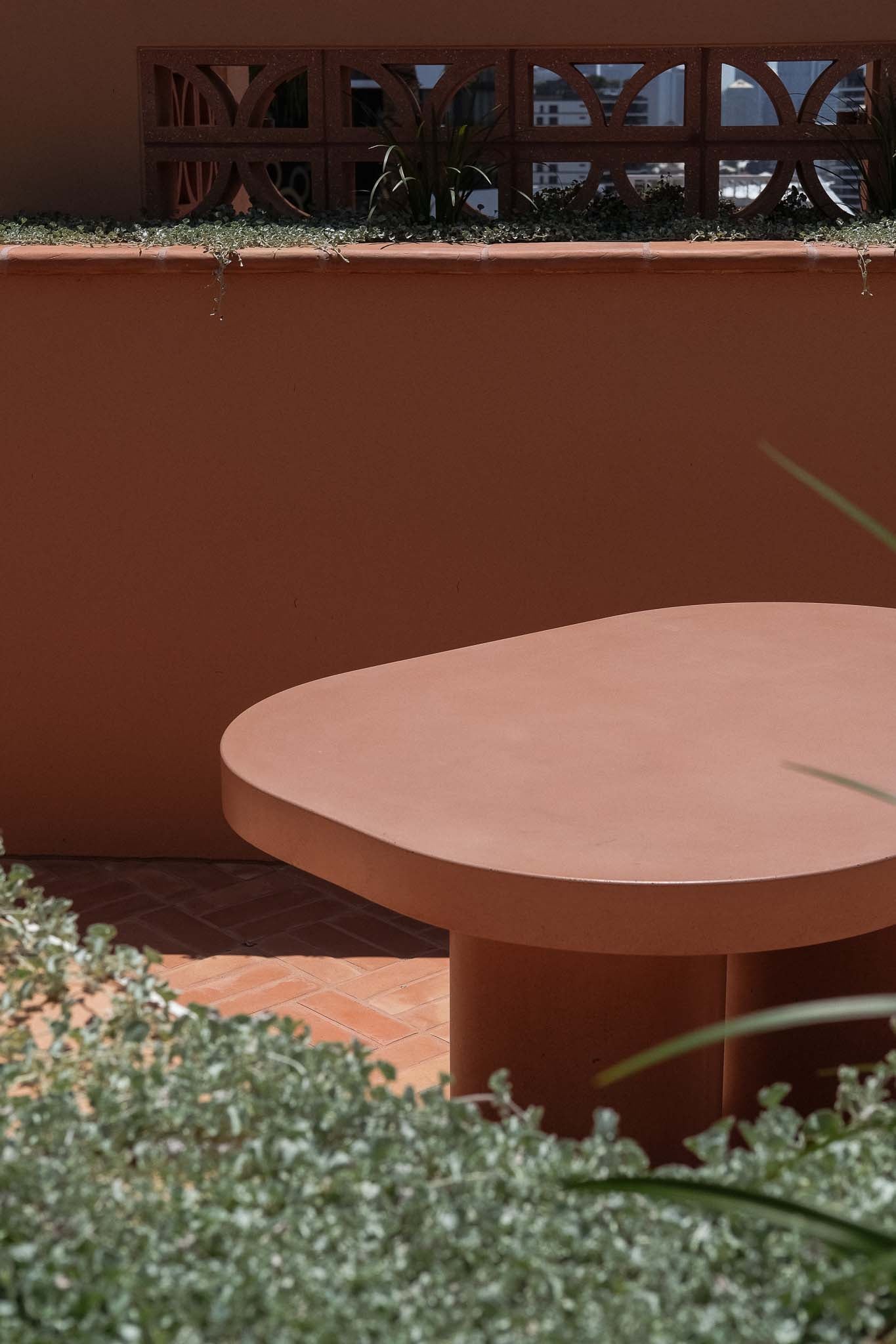 In any gathering space, table design is crucialโit often serves as the central anchor that defines the room's flow and invites social interaction. The three concrete dining tables on the rooftop achieve this balance effortlessly. Acting as understated yet striking centrepieces, they guide the arrangement of surrounding furniture, creating harmonious spaces where form and function merge seamlessly.