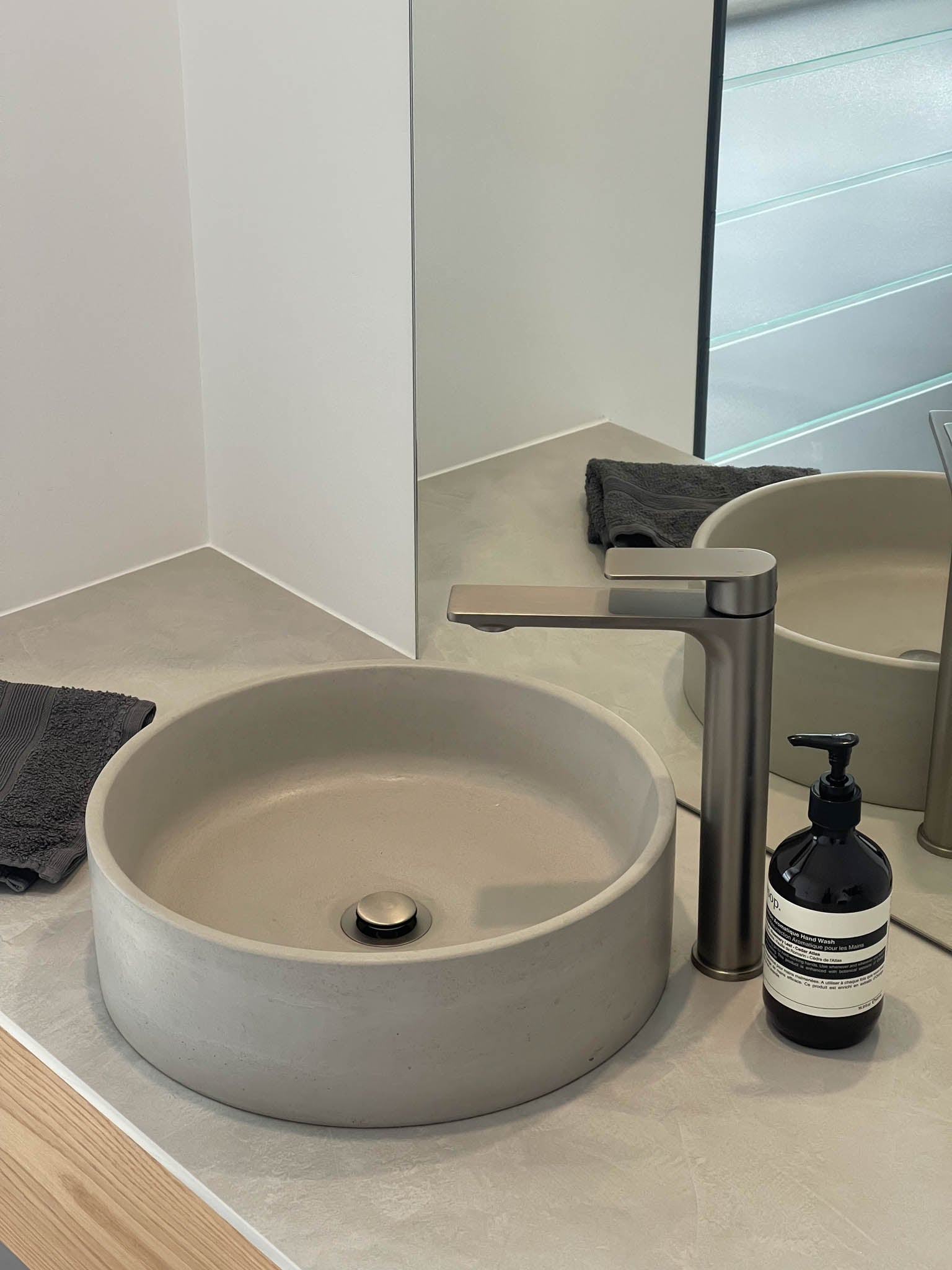 The clean, rounded form of our Comet Concrete Basin is highly versatile and perfect for bringing softness to any space. Each piece is uniquely made to order. The Comet is an above counter design. This basin design works well on a concrete countertop or as a concrete basin vanity.